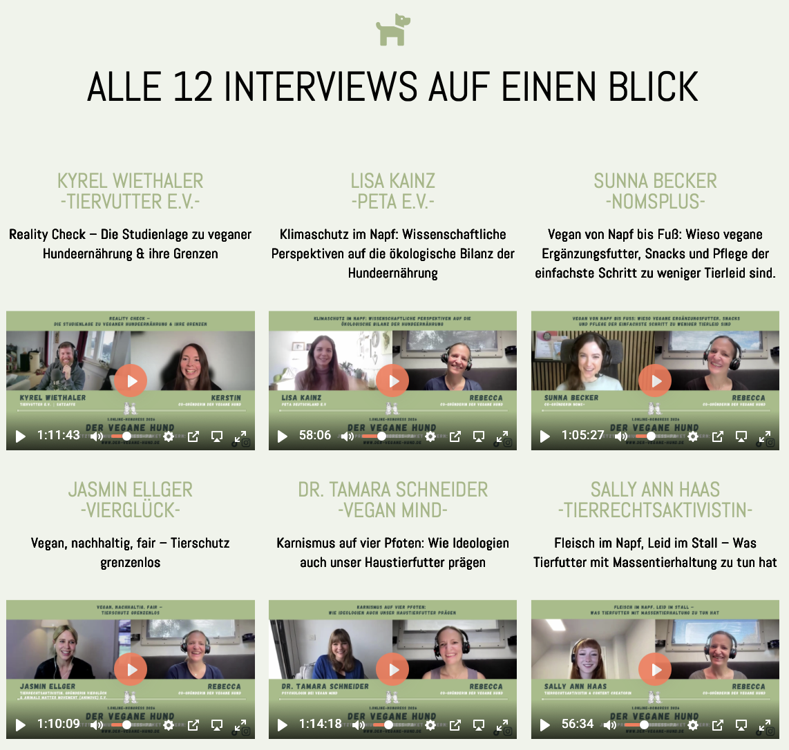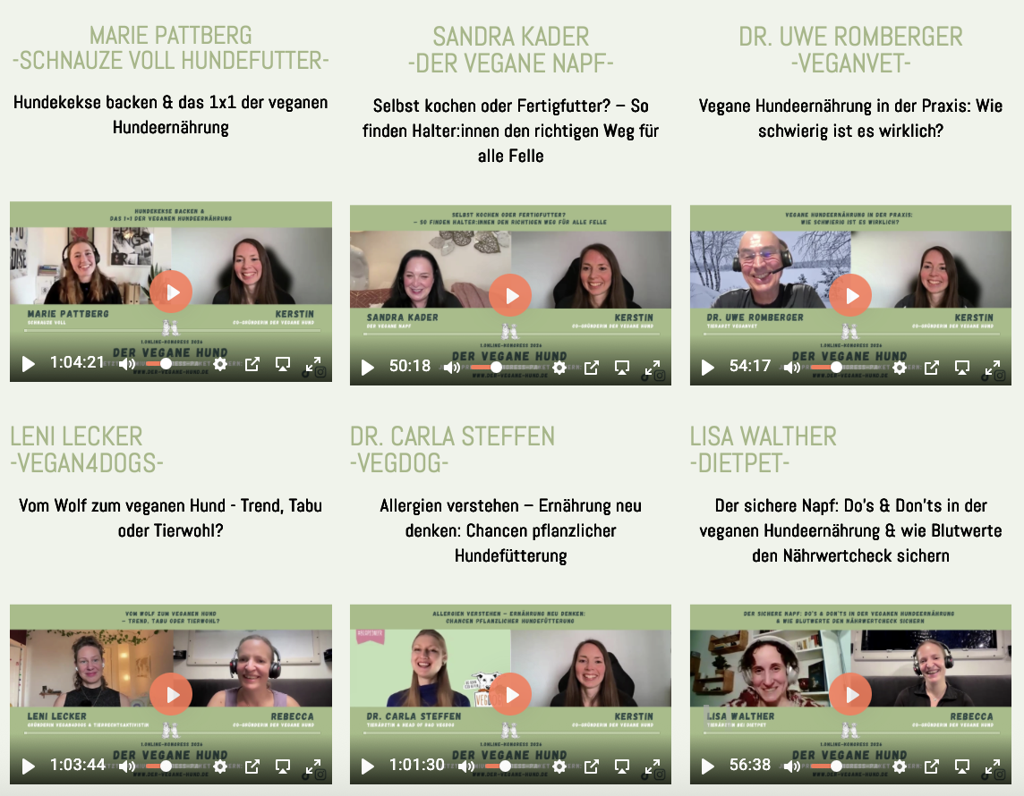 Mit dem Premium-Kongress-Paket erhältst du ab sofort unbegrenzten Zugriff auf alle Experten-Interviews des 1.Online-Kongresses DER VEGANE HUND – ganz ohne Zeitdruck. Statt nur 24 Stunden kannst du alle Interviews flexibel ansehen, pausieren und jederzeit wieder aufrufen – auch nach dem Kongress – bis zum Ende des Jahres!